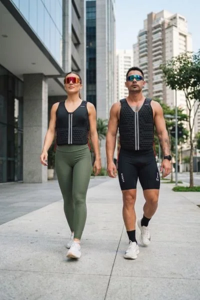 Queima calórica elevada: carregar entre 10% e 15% do peso corporal durante a caminhada aumenta o gasto energético em 30% a 45% em comparação com caminhar sem peso. Uma pessoa de 70kg queimando 300 calorias numa caminhada normal passa a queimar entre 390 e 435 calorias com o colete.